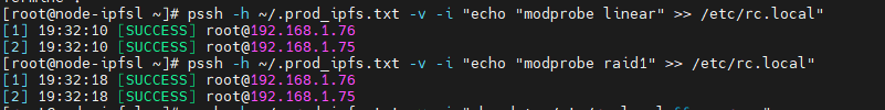 [root@node-ipfsl ~]# pssh -h ~/.prod_ipfs.txt -v -i "echo "modprobe raid1" >> /etc/rc.local"