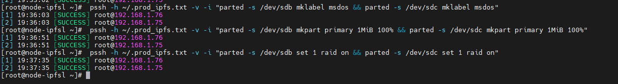 [root@node-ipfsl ~]# pssh -h ~/.prod_ipfs.txt -v -i "parted -s /dev/sdb set 1 raid on && parted -s /dev/sdc set 1 raid on"
