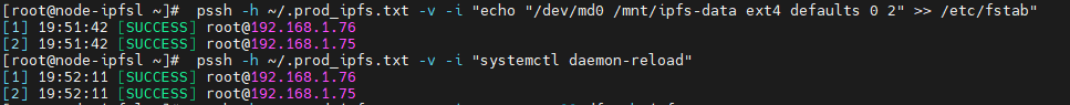 [root@node-ipfsl ~]# pssh -h ~/.prod_ipfs.txt -v -i "echo "/dev/md0 /mnt/ipfs-data ext4 defaults 0 2" >> /etc/fstab"