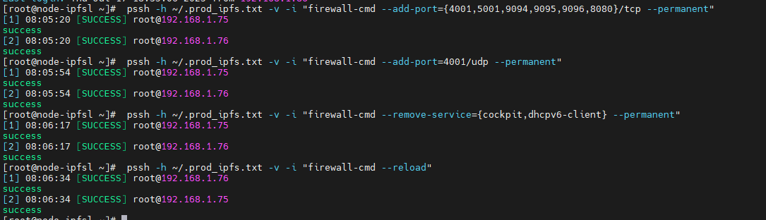 [root@node-ipfsl ~]# pssh -h ~/.prod_ipfs.txt -v -i "firewall-cmd --reload"