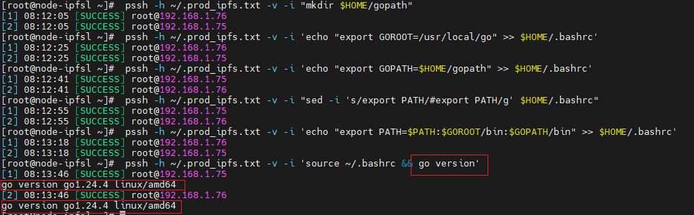 [root@node-ipfsl ~]# pssh -h ~/.prod_ipfs.txt -v -i 'source ~/.bashrc && go version'