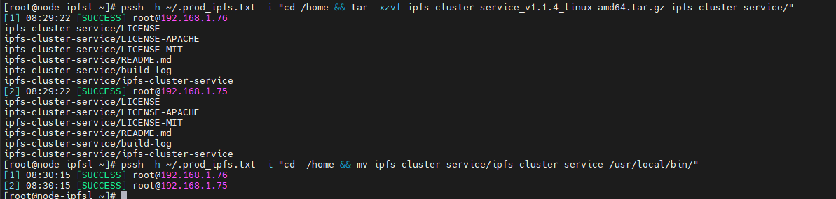 [root@node-ipfsl ~]# pssh -h ~/.prod_ipfs.txt -i "cd /home && tar -xzvf ipfs-cluster-service_v1.1.4_linux-amd64.tar.gz ipfs-cluster-service/"