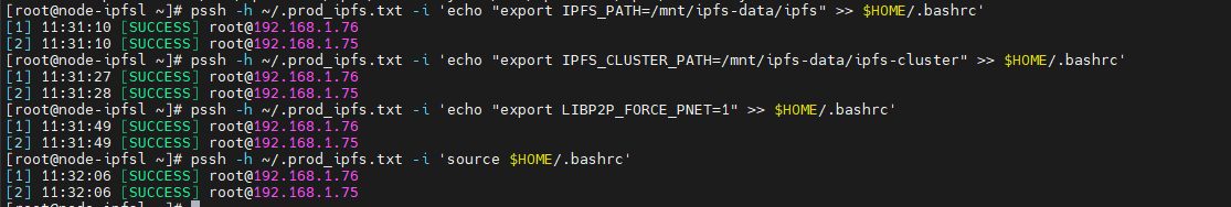 [root@node-ipfsl ~]# pssh -h ~/.prod_ipfs.txt -i 'echo "export IPFS_CLUSTER_PATH=/mnt/ipfs-data/ipfs-cluster" >> $HOME/.bashrc'