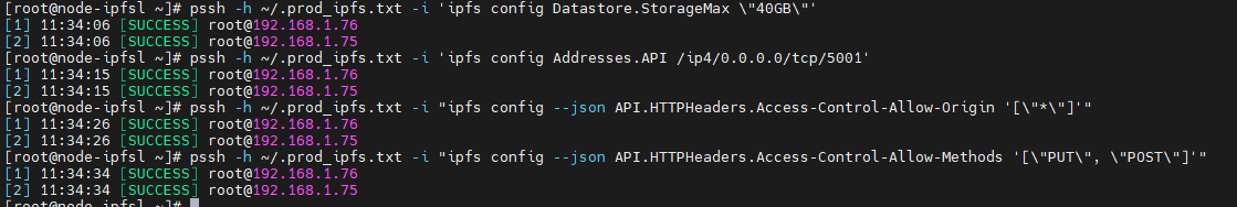 [root@node-ipfsl ~]# pssh -h ~/.prod_ipfs.txt -i "ipfs config --json API.HTTPHeaders.Access-Control-Allow-Methods '[\"PUT\", \"POST\"]'"