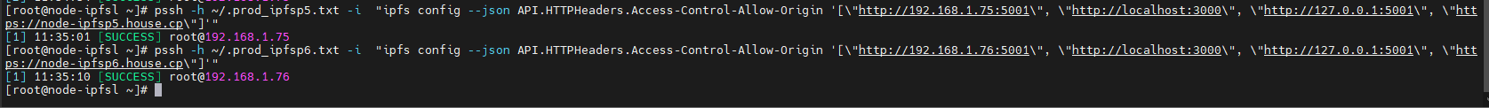 [root@node-ipfsl ~]# pssh -h ~/.prod_ipfsp6.txt -i "ipfs config --json API.HTTPHeaders.Access-Control-Allow-Origin '[\"http://192.168.1.76:5001\", \"http://localhost:3000\", \"http://127.0.0.1:5001\", \"https://node-ipfsp6.house.cp\"]'"