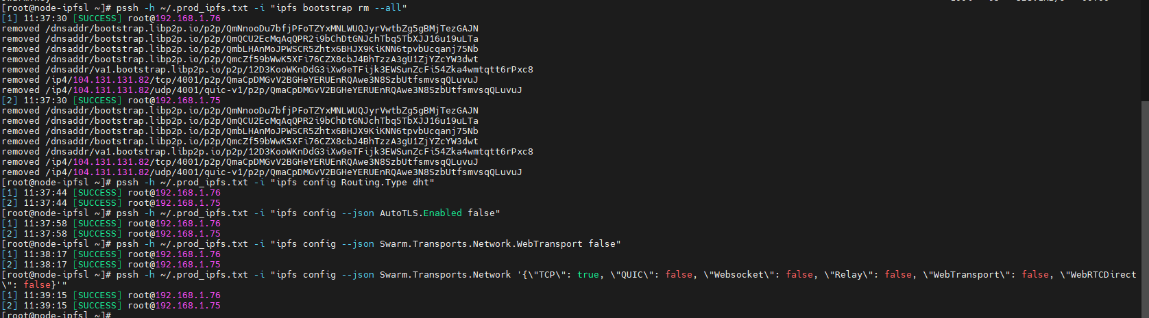[root@node-ipfsl ~]# pssh -h ~/.prod_ipfs.txt -i "ipfs config --json Swarm.Transports.Network '{\"TCP\": true, \"QUIC\": false, \"Websocket\": false, \"Relay\": false, \"WebTransport\": false, \"WebRTCDirect\": false}'"
