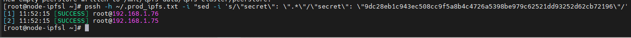 [root@node-ipfsl ~]# pssh -h ~/.prod_ipfs.txt -i "sed -i 's/\"secret\": \".*\"/\"secret\": \"9dc28eb1c943ec508cc9f5a8b4c4726a5398be979c62521dd93252d62cb72196\"/' /mnt/ipfs-data/ipfs-cluster/service.json"