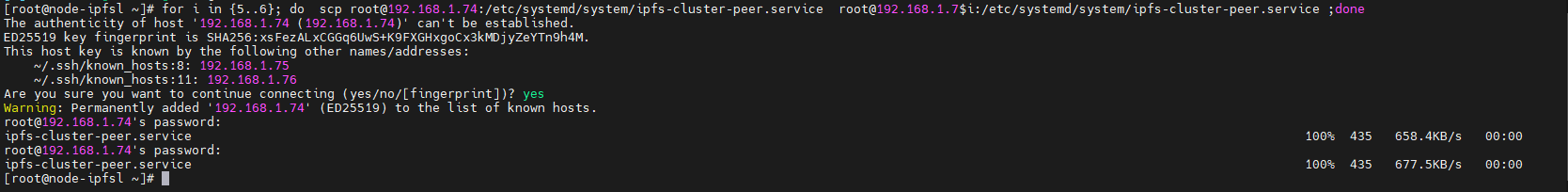 [root@node-ipfsl ~]# for i in {5..6}; do scp root@192.168.1.74:/etc/systemd/system/ipfs-cluster-peer.service root@192.168.1.7$i:/etc/systemd/system/ipfs-cluster-peer.service ;done