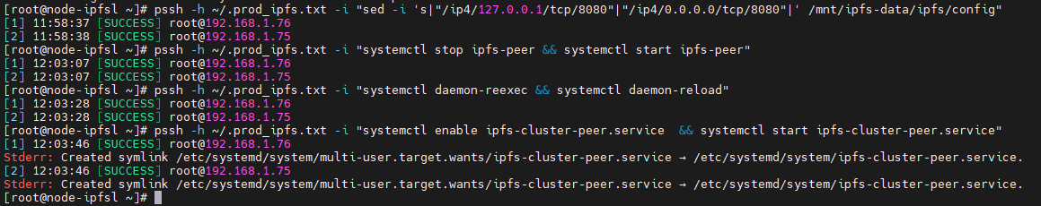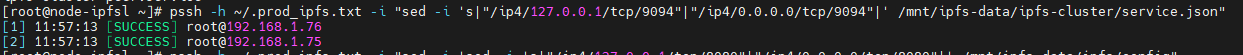 [root@node-ipfsl ~]# pssh -h ~/.prod_ipfs.txt -i "sed -i 's|"/ip4/127.0.0.1/tcp/9094"|"/ip4/0.0.0.0/tcp/9094"|' /mnt/ipfs-data/ipfs-cluster/service.json"