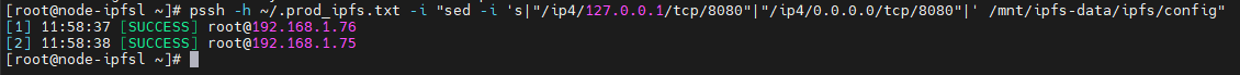 [root@node-ipfsl ~]# pssh -h ~/.prod_ipfs.txt -i "sed -i 's|"/ip4/127.0.0.1/tcp/8080"|"/ip4/0.0.0.0/tcp/8080"|' /mnt/ipfs-data/ipfs/config"
