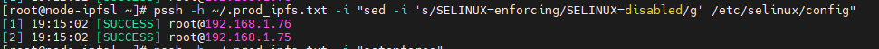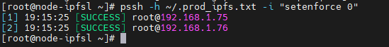 [root@node-ipfsl ~]# pssh -h ~/.prod_ipfs.txt -i "setenforce 0"