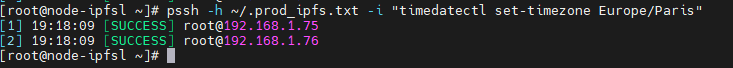 [root@node-ipfsl ~]# pssh -h ~/.prod_ipfs.txt -i "timedatectl set-timezone Europe/Paris"