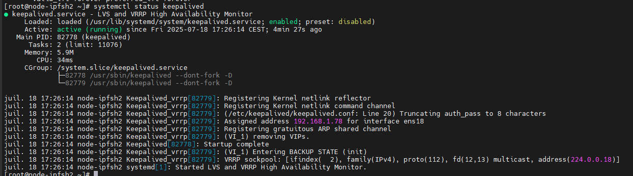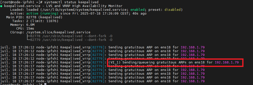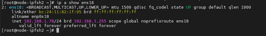 [root@node-ipfshx ~]# systemctl enable keepalived Created symlink /etc/systemd/system/multi-user.target.wants/keepalived.service → /usr/lib/systemd/system/keepalived.service. [root@node-ipfshx ~]# systemctl start keepalived