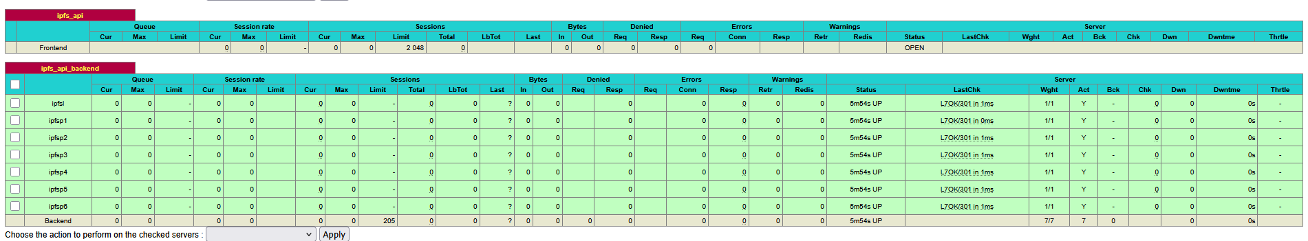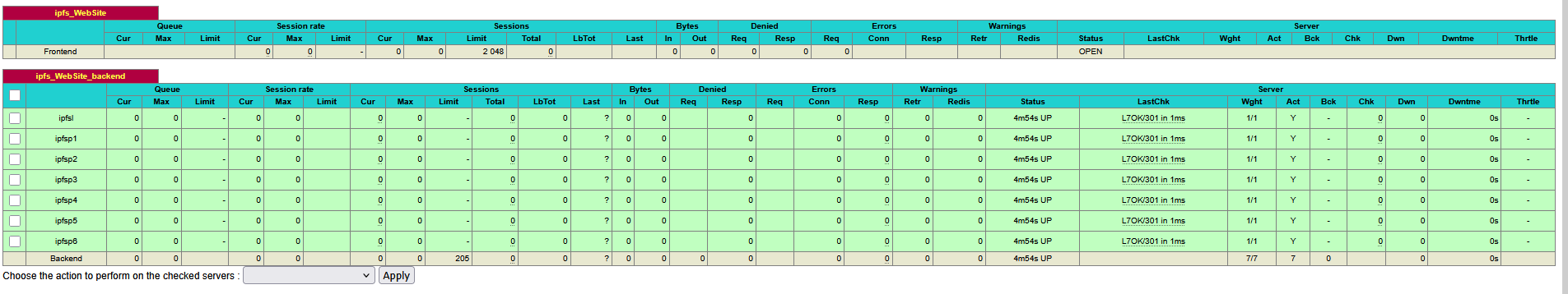 [root@node-ipfshx ~]# vi /etc/haproxy/haproxy.cfg global log /dev/log local0 log /dev/log local1 notice daemon maxconn 2048 defaults log global mode http option httplog option dontlognull retries 2 timeout client 30m timeout connect 4s timeout server 30m timeout check 5s listen stats mode http bind *:1234 stats enable stats uri /status stats refresh 2s stats auth chris:Chris stats admin if TRUE # Frontend pour le Site Web IPFS (port 80 → 8080) frontend ipfs_WebSite bind *:80 mode http default_backend ipfs_WebSite_backend # Backend vers les serveurs IPFS sur port 8080 backend ipfs_WebSite_backend mode http balance roundrobin option httpchk GET /ipfs/QmSaVM6BoUmyPuiEs6FGo5PH9eYDReHAYubb9sZkcCJcrk server ipfsl 192.168.1.70:8080 check inter 2s server ipfsp1 192.168.1.71:8080 check inter 2s server ipfsp2 192.168.1.72:8080 check inter 2s server ipfsp3 192.168.1.73:8080 check inter 2s server ipfsp4 192.168.1.74:8080 check inter 2s server ipfsp5 192.168.1.75:8080 check inter 2s server ipfsp6 192.168.1.76:8080 check inter 2s #Frontend pour l’API IPFS (port 5001 → 5001) frontend ipfs_api bind *:5001 mode http default_backend ipfs_api_backend # Backend vers les serveurs IPFS sur port 5001 backend ipfs_api_backend mode http balance roundrobin option httpchk GET /webui server ipfsl 192.168.1.70:5001 check inter 2s server ipfsp1 192.168.1.71:5001 check inter 2s server ipfsp2 192.168.1.72:5001 check inter 2s server ipfsp3 192.168.1.73:5001 check inter 2s server ipfsp4 192.168.1.74:5001 check inter 2s server ipfsp5 192.168.1.75:5001 check inter 2s server ipfsp6 192.168.1.76:5001 check inter 2s