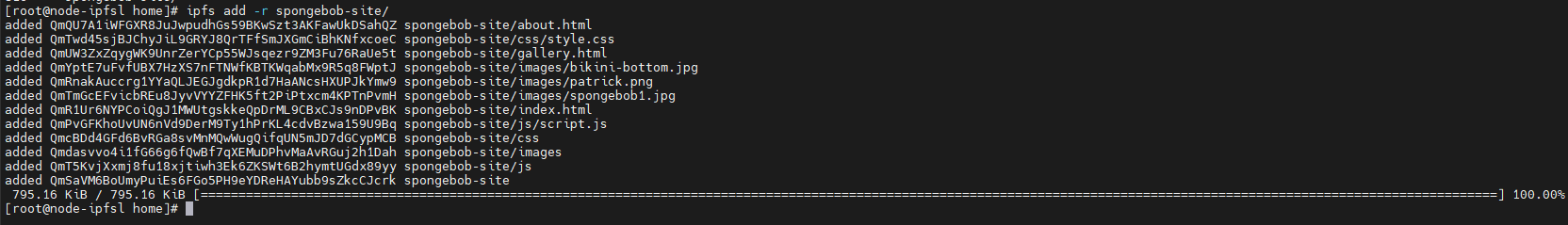 [root@node-ipfsl home]# ipfs add -r spongebob-site/ added QmQU7A1iWFGXR8JuJwpudhGs59BKwSzt3AKFawUkDSahQZ spongebob-site/about.html added QmTwd45sjBJChyJiL9GRYJ8QrTFfSmJXGmCiBhKNfxcoeC spongebob-site/css/style.css added QmUW3ZxZqygWK9UnrZerYCp55WJsqezr9ZM3Fu76RaUe5t spongebob-site/gallery.html added QmYptE7uFvfUBX7HzXS7nFTNWfKBTKWqabMx9R5q8FWptJ spongebob-site/images/bikini-bottom.jpg added QmRnakAuccrg1YYaQLJEGJgdkpR1d7HaANcsHXUPJkYmw9 spongebob-site/images/patrick.png added QmTmGcEFvicbREu8JyvVYYZFHK5ft2PiPtxcm4KPTnPvmH spongebob-site/images/spongebob1.jpg added QmR1Ur6NYPCoiQgJ1MWUtgskkeQpDrML9CBxCJs9nDPvBK spongebob-site/index.html added QmPvGFKhoUvUN6nVd9DerM9Ty1hPrKL4cdvBzwa159U9Bq spongebob-site/js/script.js added QmcBDd4GFd6BvRGa8svMnMQwWugQifqUN5mJD7dGCypMCB spongebob-site/css added Qmdasvvo4i1fG66g6fQwBf7qXEMuDPhvMaAvRGuj2h1Dah spongebob-site/images added QmT5KvjXxmj8fu18xjtiwh3Ek6ZKSWt6B2hymtUGdx89yy spongebob-site/js added QmSaVM6BoUmyPuiEs6FGo5PH9eYDReHAYubb9sZkcCJcrk spongebob-site