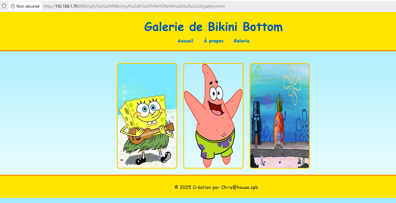[root@node-ipfsl spongebob-site]# vi gallery.html <!DOCTYPE html> <html lang="fr"> <head> <meta charset="UTF-8"> <title>Galerie</title> <link rel="stylesheet" href="css/style.css"> <script src="js/script.js" defer></script> </head> <body> <header> <h1>Galerie de Bikini Bottom</h1> <nav> <a href="index.html">Accueil</a> <a href="about.html">À propos</a> <a href="gallery.html">Galerie</a> </nav> </header> <main> <section class="gallery"> <img src="images/spongebob1.jpg" alt="SpongeBob" width="200"> <img src="images/patrick.png" alt="Patrick" width="200"> <img src="images/bikini-bottom.jpg" alt="Bikini Bottom" width="200"> </section> </main> <footer> <p>© 2025 Création par Chris@house.cpb</p> </footer> </body> </html>