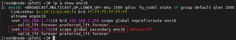 [root@node-ipfsh1 ~]# vi /etc/keepalived/keepalived.conf ! /etc/keepalived/keepalived.conf ! Configuration File for keepalived global_defs { notification_email { chris@house.cpb } notification_email_from chris@house.cpb smtp_server localhost smtp_connect_timeout 30 } vrrp_instance VI_1 { state MASTER interface ens18 virtual_router_id 100 priority 200 authentication { auth_type PASS auth_pass EYZTE865433021 } virtual_ipaddress { 192.168.1.79/24 dev ens18 } }