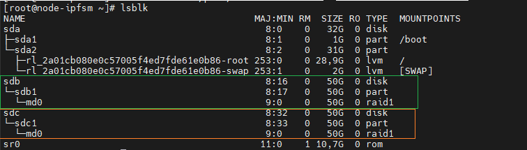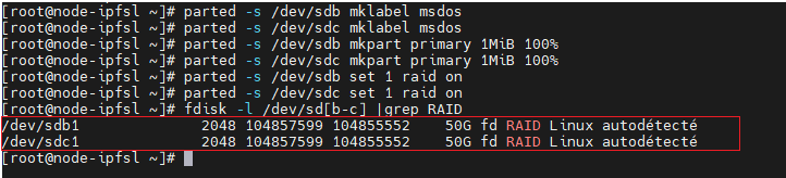 [root@node-ipfsx ~]# parted -s /dev/sdc mklabel msdos [root@node-ipfsx ~]# parted -s /dev/sdc mkpart primary 1MiB 100% [root@node-ipfsx ~]# parted -s /dev/sdc set 1 raid on [root@node-ipfsx ~]# fdisk -l /dev/sd[b-c] |grep RAID