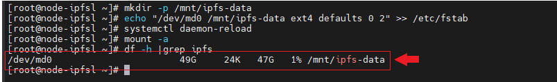[root@node-ipfsx ~]# echo "/dev/md0 /mnt/ipfs-data ext4 defaults 0 2" >> /etc/fstab [root@node-ipfsx ~]# systemctl daemon-reload [root@node-ipfsx ~]# mount -a [root@node-ipfsx ~]# df -h |grep ipfs