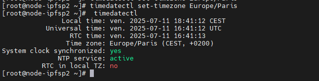 [root@node-ipfsx ~]# timedatectl set-timezone Europe/Paris [root@node-ipfsx ~]# timedatectl