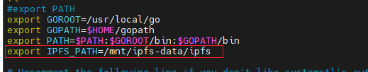 [root@node-ipfsx home]# export IPFS_PATH=/mnt/ipfs-data/ipfs [root@node-ipfsx home]# vi $HOME/.bashrc
