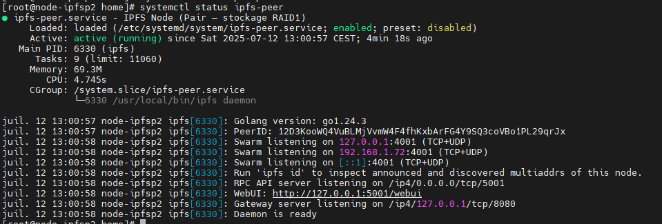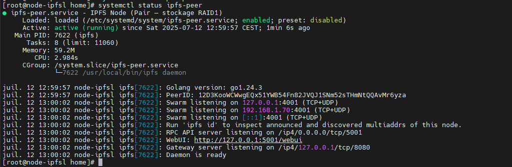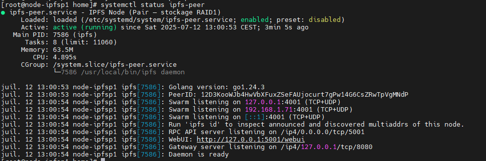 [root@node-ipfsx home]# vi /etc/systemd/system/ipfs-peer.service [Unit] Description=IPFS Node (Pair – stockage RAID1) After=network.target [Service] User=root Environment="IPFS_PATH=/mnt/ipfs-data/ipfs" ExecStart=/usr/local/bin/ipfs daemon Restart=on-failure LimitNOFILE=10240 [Install] WantedBy=multi-user.target