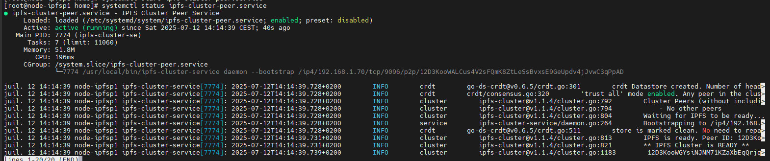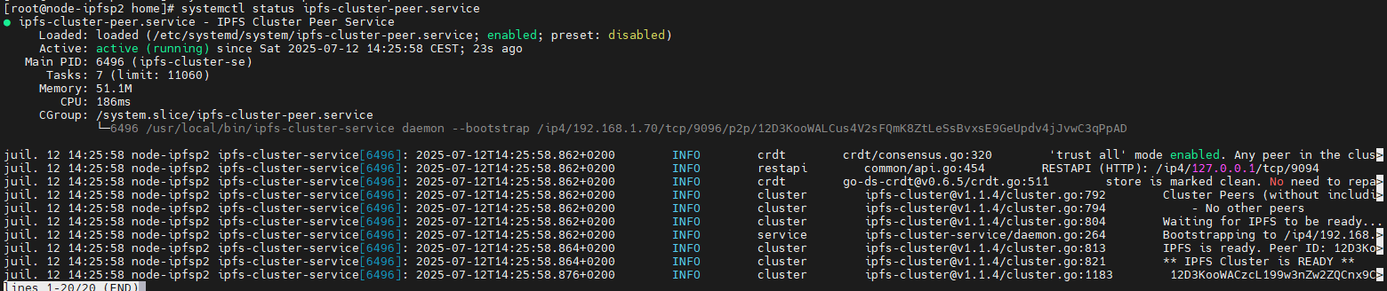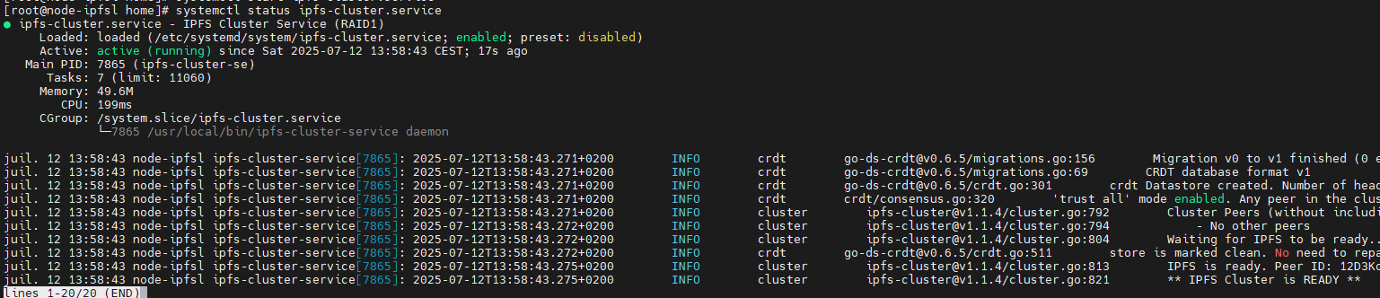 [root@node-ipfsl home]# systemctl daemon-reexec [root@node-ipfsl home]# systemctl daemon-reload [root@node-ipfsl home]# systemctl enable ipfs-cluster.service Created symlink /etc/systemd/system/multi-user.target.wants/ipfs-cluster.service → /etc/systemd/system/ipfs-cluster.service. .[root@node-ipfsl home]# systemctl start ipfs-cluster.service