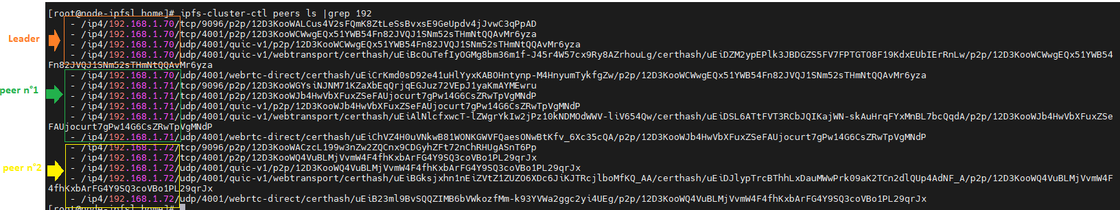 [root@node-ipfsl home]# ipfs-cluster-ctl id |head -8 12D3KooWALCus4V2sFQmK8ZtLeSsBvxsE9GeUpdv4jJvwC3qPpAD | node-ipfsl | Sees 0 other peers > Addresses: - /ip4/127.0.0.1/tcp/9096/p2p/12D3KooWALCus4V2sFQmK8ZtLeSsBvxsE9GeUpdv4jJvwC3qPpAD - /ip4/192.168.1.70/tcp/9096/p2p/12D3KooWALCus4V2sFQmK8ZtLeSsBvxsE9GeUpdv4jJvwC3qPpAD