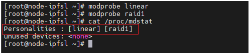 [root@node-ipfsx ~]# modprobe linear [root@node-ipfsx ~]# modprobe raid1 [root@node-ipfsx ~]# cat /proc/mdstat