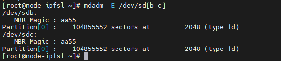 [root@node-ipfsx ~]# mdadm -E /dev/sd[b-c] mdadm: No md superblock detected on /dev/sdb. mdadm: No md superblock detected on /dev/sdc.