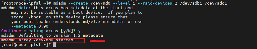 [root@node-ipfsx ~]# mdadm --create /dev/md0 --level=1 --raid-devices=2 /dev/sdb1 /dev/sdc1